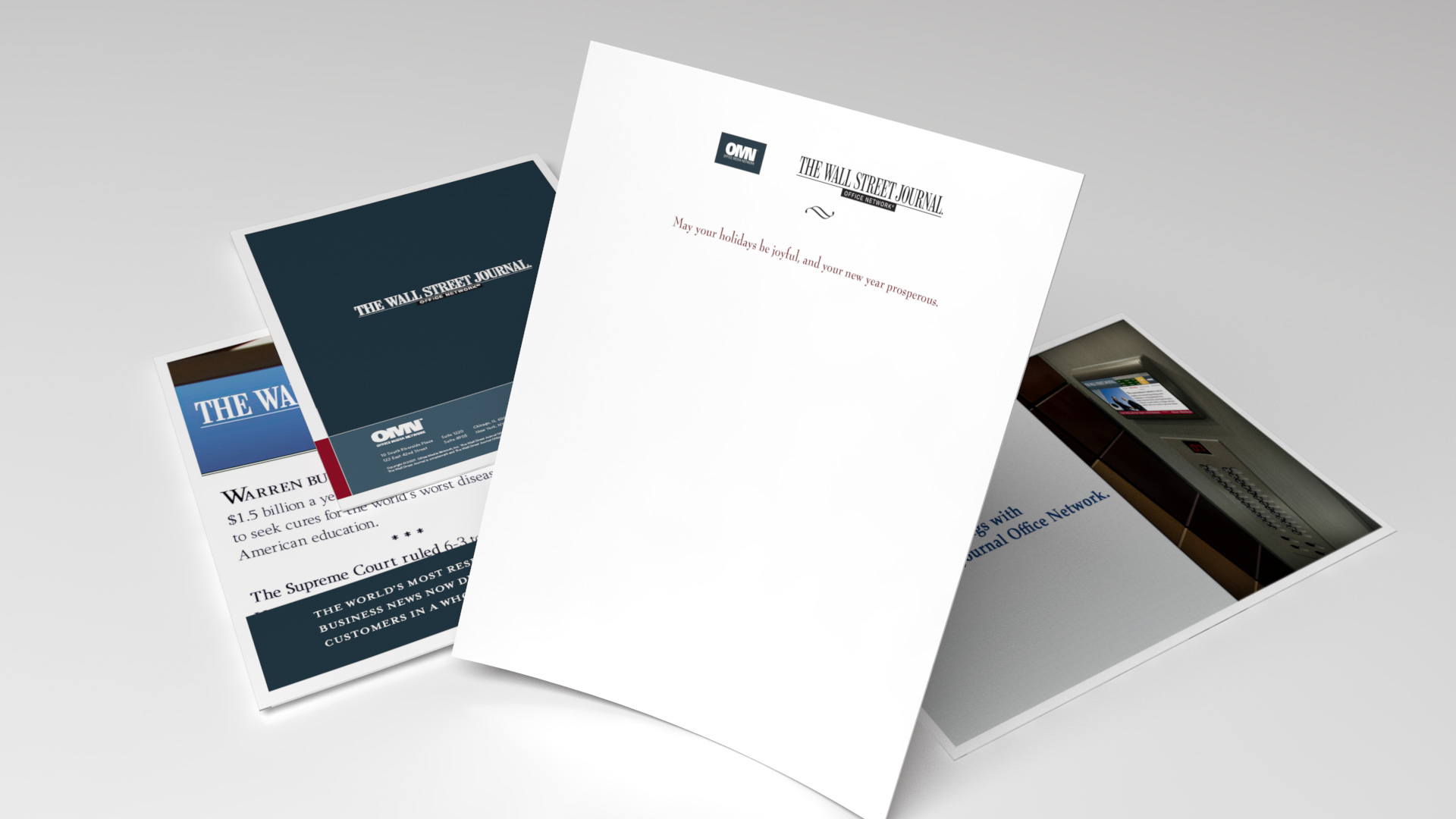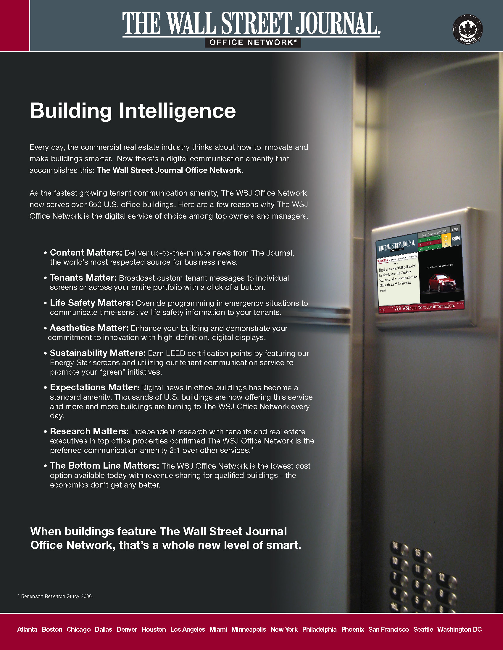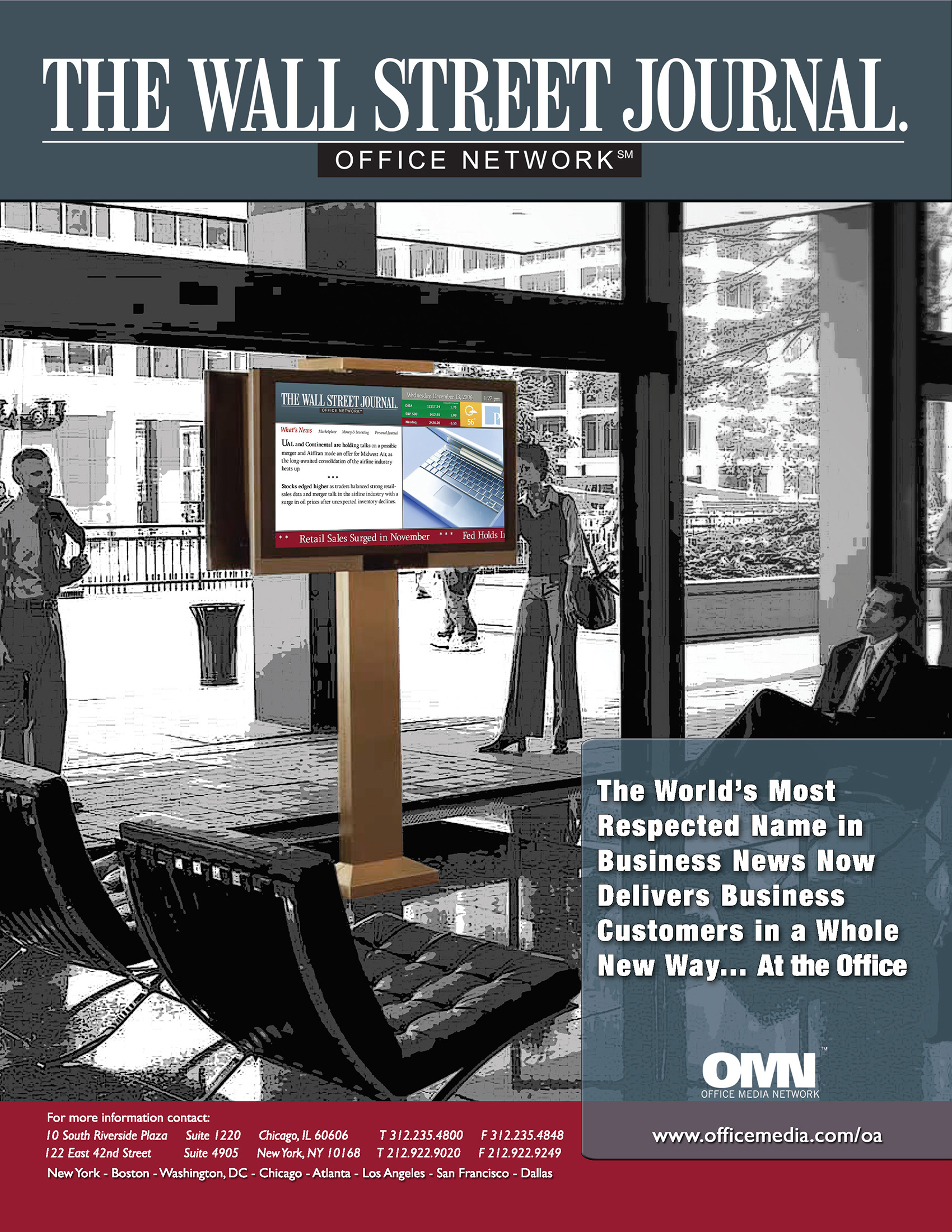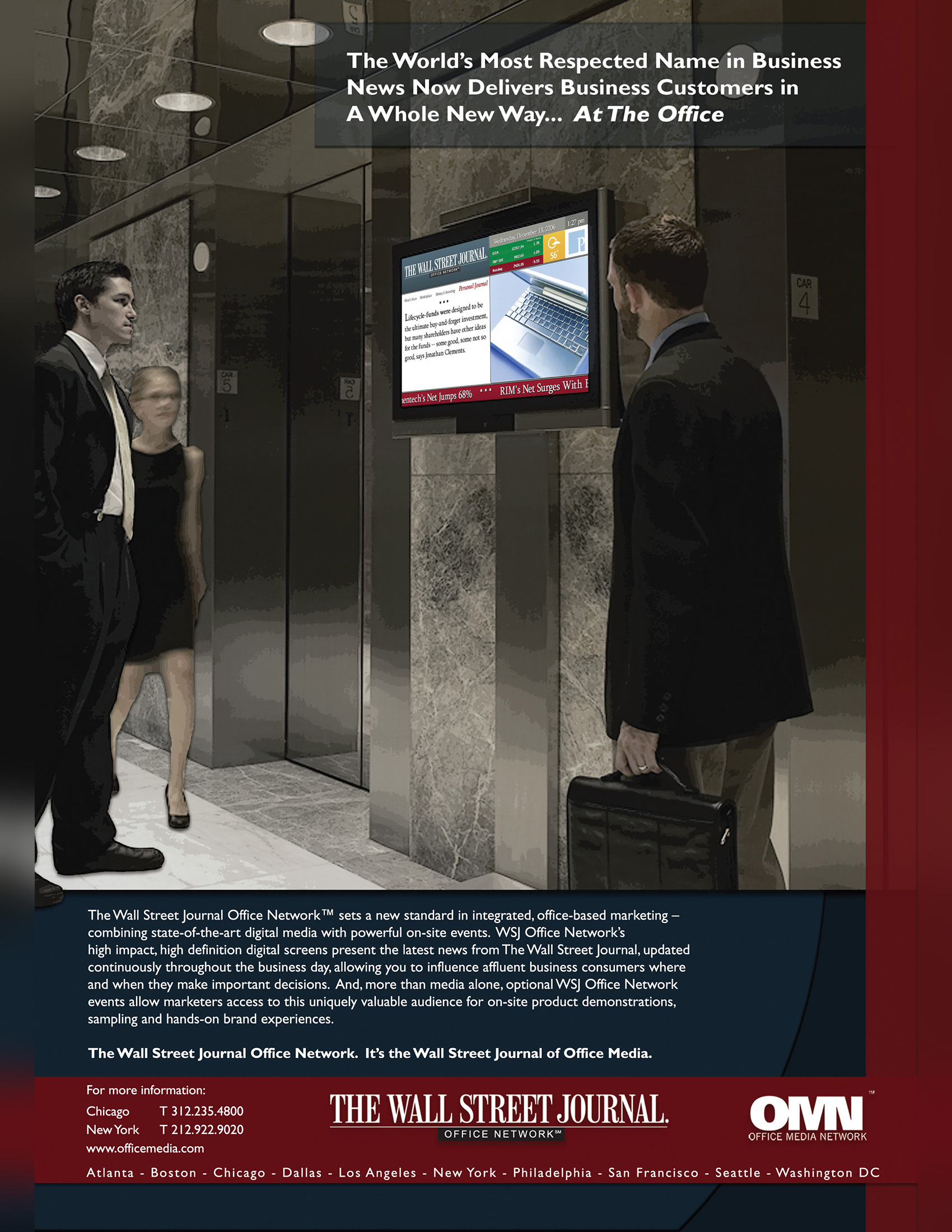 The Wall Street Journal Office Network is a leading digital place-based media and marketing network. The network consists of large, high-definition screens located in the lobbies and elevators of 760+ premier office buildings in 15 major U.S. cities, and is viewed by approximately 1 million affluent, business decision-makers each business day. As an advertising vehicle, The Wall Street Journal Office Network is unique in its ability to deliver highly impactful messages at work, closest to the moments when customers are considering and making important buying decisions....